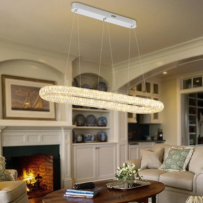 Oval Crystal Ring Chandelier for Living Room, 47.2'' Chrome Ring Pendant Light for Kitchen Island Modern Linear Oval Chandeliers for Dining Room Dimmable 3000K-6000K