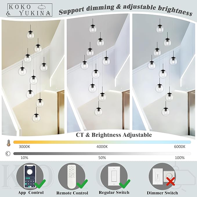 KoKo&Yukina 9-Light Globe Glass Pendant Light Adjustable Length Pendant Lights Fixtures Modern Black Clear Globe Glass Chandelier High Ceiling Lights Fixtures for Foyer Staircase (Bulb & Remote Incl)