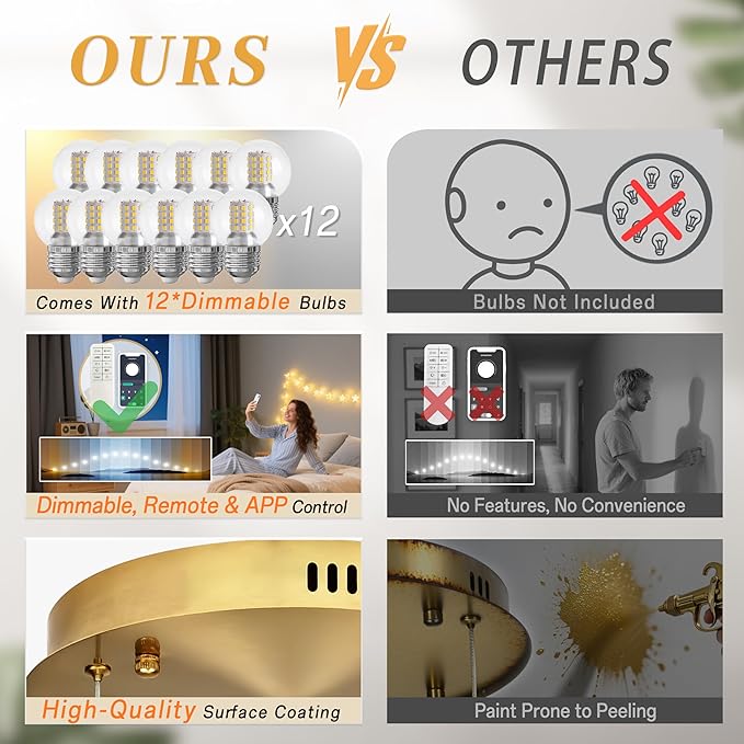 - [Dimmable & Smart Control]: 3 custom tri - color bulbs enable 0% - 100% brightness dimming, working with remote/APP (follow instructions). For color inconsistency, reinsert bulbs and keep lit for ≥15 mins — bulbs “memorize” the uniform hue. (Wall Dimmers Not Supported)