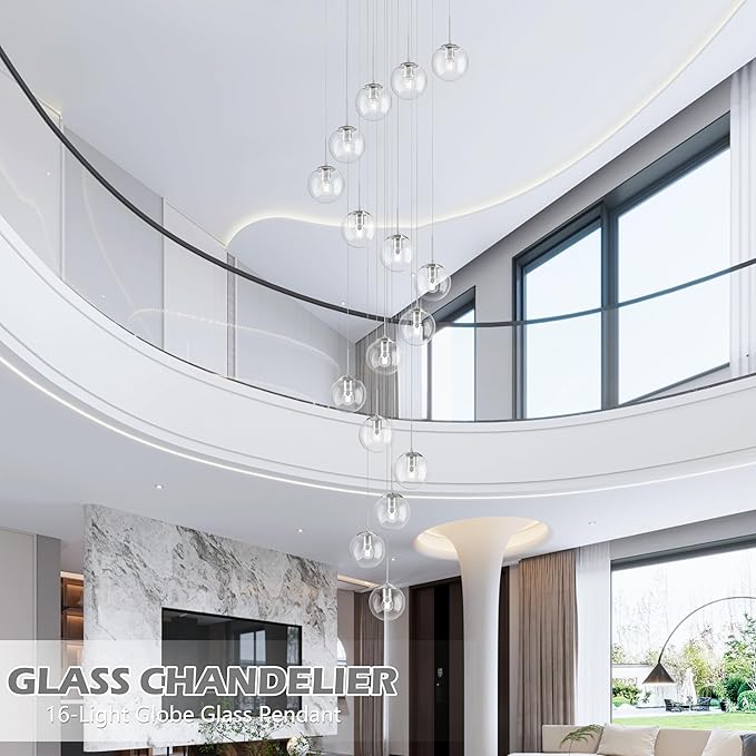 KoKo&Yukina 16-Light Nickel Mid Century Modern Chandelier for Living Room Staircase Chandelier for Entryway Clear Globe Glass Chandelier High Ceiling Chandeliers Foyer Entryway (Bulb & Remote Incl.)