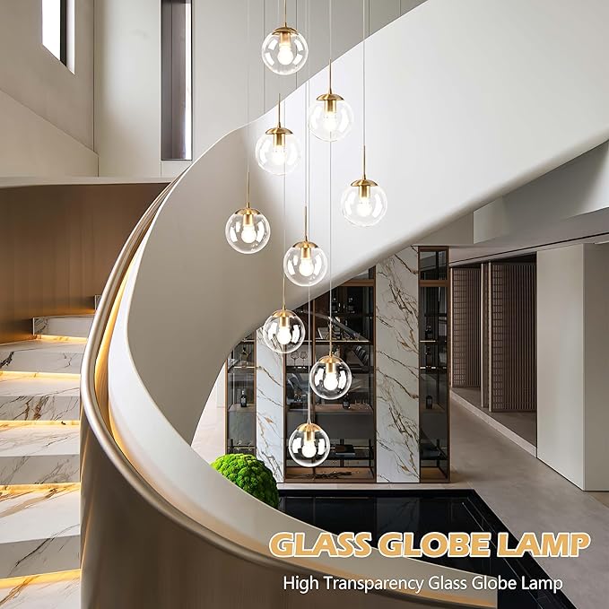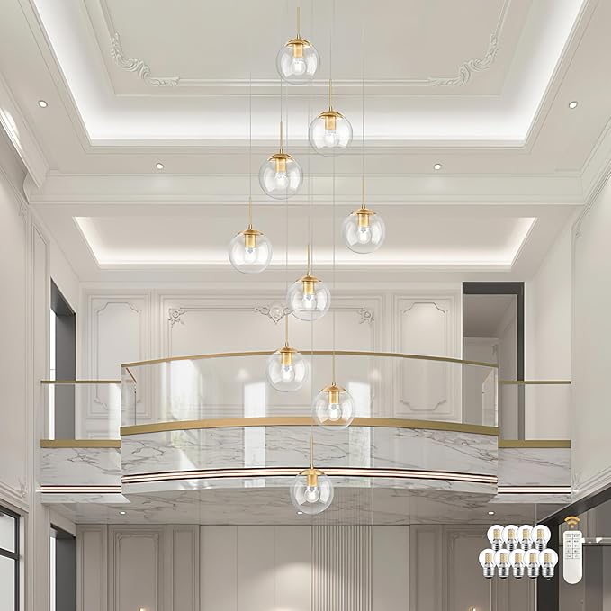KoKo&Yukina 9-Light Globe Glass Pendant Light Adjustable Length Pendant Lights Fixtures Modern Gold Clear Globe Glass Chandelier High Ceiling Lights Fixtures for Foyer Staircase (Bulb & Remote Incl)