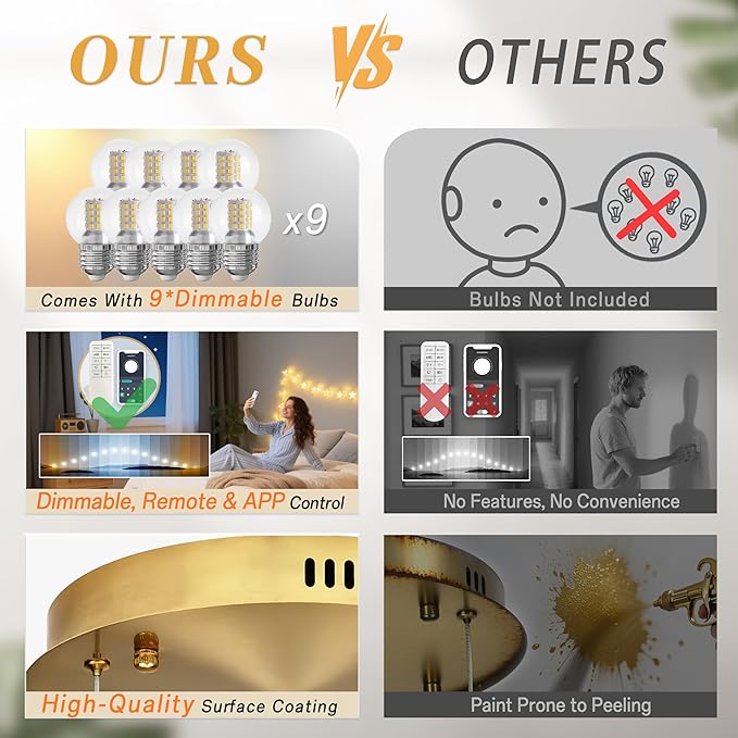 - [Dimmable & Smart Control]: 3 custom tri - color bulbs enable 0% - 100% brightness dimming, working with remote/APP (follow instructions). For color inconsistency, reinsert bulbs and keep lit for ≥15 mins — bulbs “memorize” the uniform hue. (Wall Dimmers Not Supported)