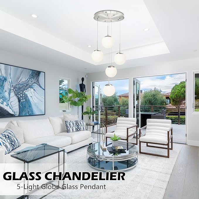 KoKo&Yukina 5-Light Globe Glass Pendant Light Adjustable Length Pendant Lights Fixtures Modern Nickel Chandelier with Milky White Glass Ceiling Lights for Foyer Hallway Bedroom (Bulb & Remote Incl.)
