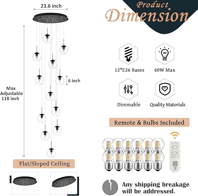 - [Dimension Design]:This black globe chandelier includes 12 x 6-inch globe shades and the ceiling tray is 23.6 inches in diameter. The total height of this chandelier is 118 inches The cable cord is adjustable and the overall shape of the fixture is simple and smooth DIY styling can be done as needed