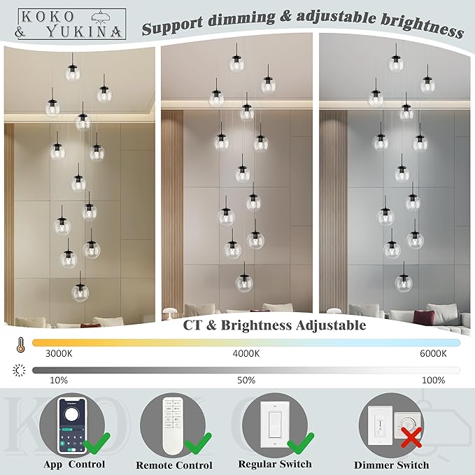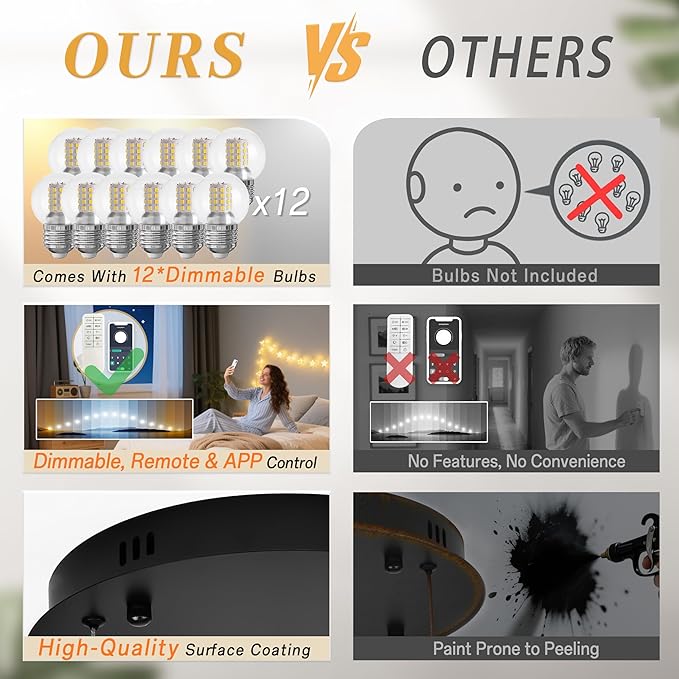 - [Dimmable & Smart Control]: 3 custom tri - color bulbs enable 0% - 100% brightness dimming, working with remote/APP (follow instructions). For color inconsistency, reinsert bulbs and keep lit for ≥15 mins — bulbs “memorize” the uniform hue. (Wall Dimmers Not Supported)