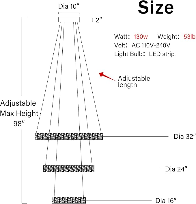 - 【Crystal Chandelier Size】Black Chandelier max height:98 inch.Ring size:16+24+32 inch,The chandelier weighs about 53 LB