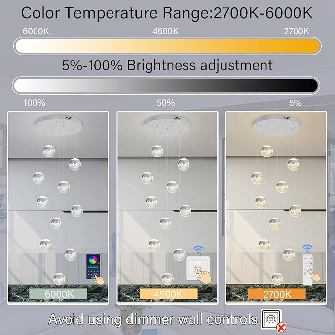 - 【Smart led Silver chandelier 】It is equipped with a remote control and APP control for seamless dimming between warm white (2700K) and cold white (6000K), as well as adjustable brightness ranging from 5 to 100 percent.