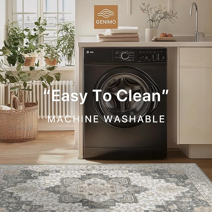 GENIMO 8x10 Area Rugs for Living Room, Machine Washable Non Slip Vintage Rugs, Low Pile Lightweight Chenille Print Rug for Bedroom, Dining Room, Home Office, Heathered Grey