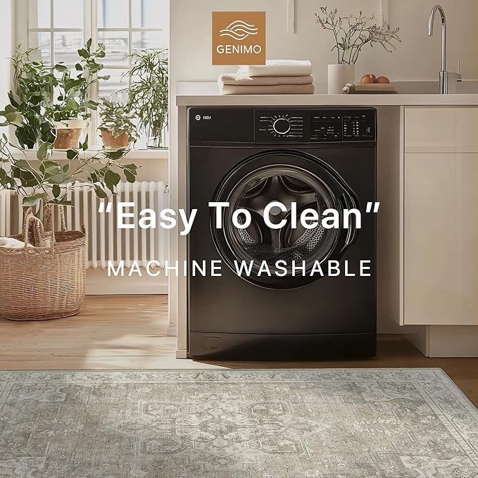 GENIMO 9x12 Area Rugs for Living Room, Non Slip Machine Washable Vintage Rugs, Low Pile Lightweight Chenille Print Large Rug for Bedroom, Dining Room, Home Office, Trench