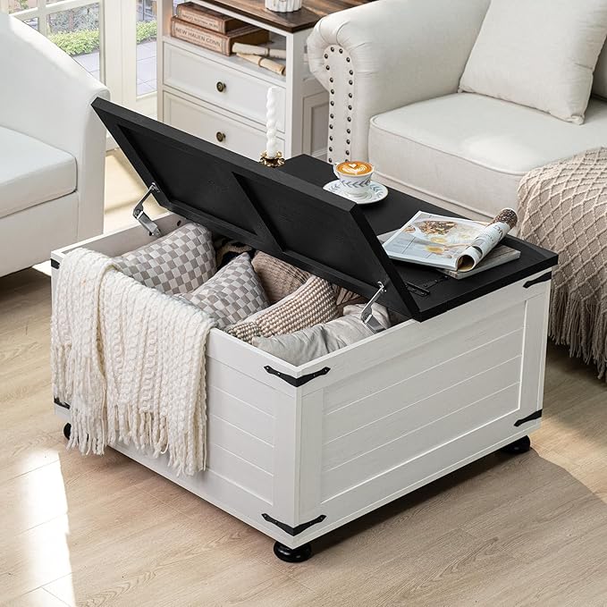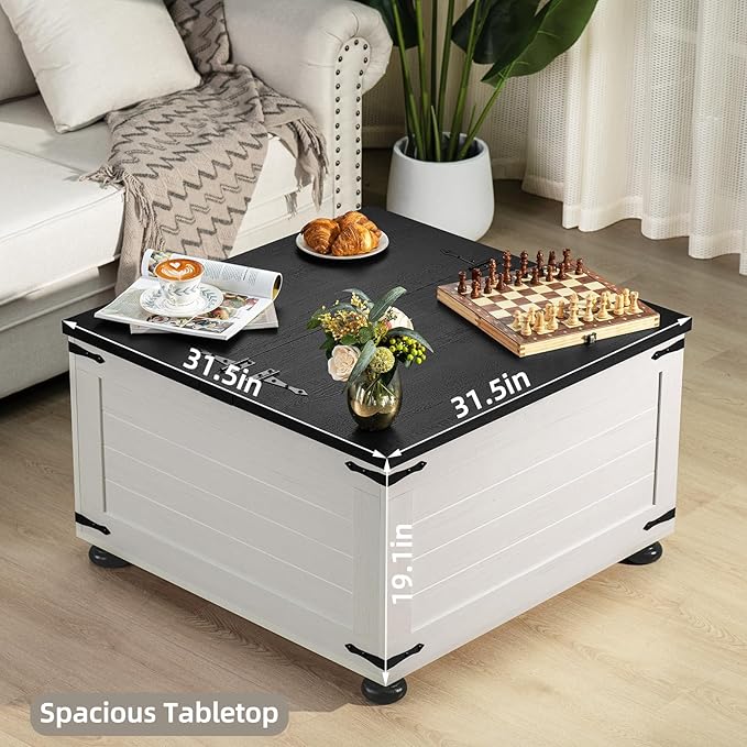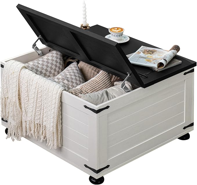 - [Large Hidden Space]This vintage square coffee table has a 59-gallon hidden storage space where you can store pillows, blankets, dolls, and more to help keep your room tidy! The two flip-top lids can be flipped up to 90°and secured for easy access to your belongings and you don't have to worry about the risk of getting pinched.