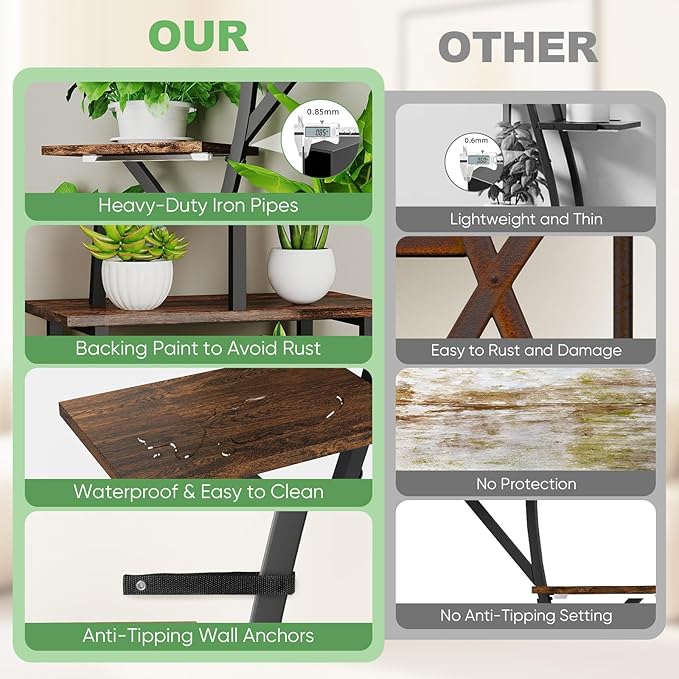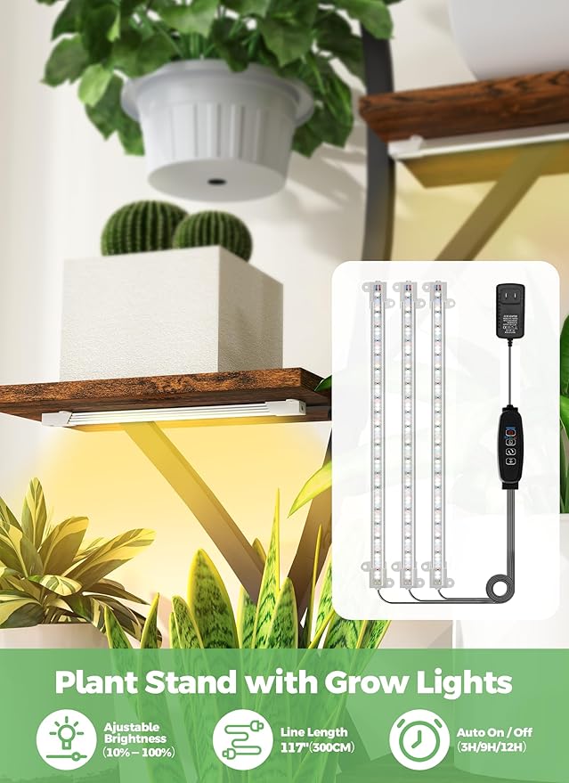 - 【Ultra-Stable, Sturdy & Safe Plant Stand 】This plant shelves with grow lights features anti-tip straps for child/pet safety. The thickened metal frame and water-resistant wood withstand daily watering without warping. The widen stable base and reinforced frame ensure stability even on uneven floors.