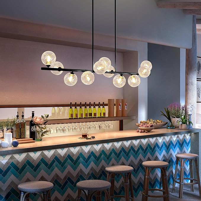 - Modern Distinctive Design: The dining room light is made of metal with a matte black finish and 11pcs clear swirled glass globe lampshades. The peculiar swirled bubbles lampshade offers a distinct design, 11 lights hand-blown swirled glass globe are staggered, accentuating the light diffusion effect in your space. The glass globe of modern chandeliers for dining room surround layout injects a fashionable and dynamic atmosphere