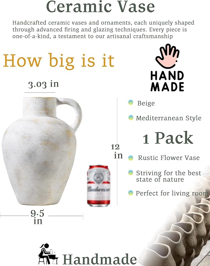 - Classic Mediterranean Style with Vintage Charm:Measuring 9.45" L x 8.26" W x 12" H, this ceramic vase features full, rounded lines with distressed black markings and beige speckles. It's an ideal accent for Mediterranean, farmhouse, or bohemian interiors, and its vintage glaze adds a handcrafted texture that enhances its nostalgic appeal.