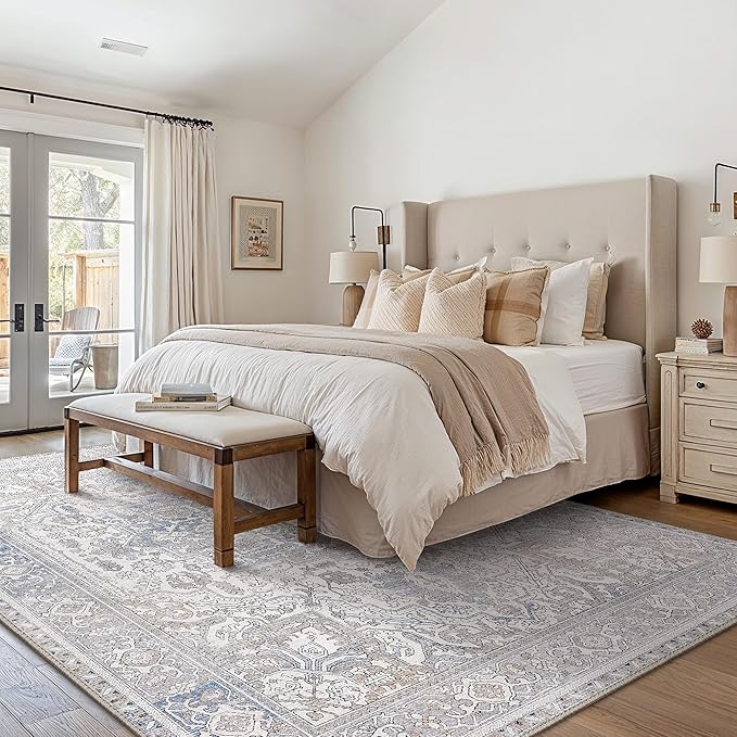 GENIMO 8x10 Area Rugs for Living Room, Machine Washable Non Slip Vintage Retro Rugs, Low Pile Lightweight Thin Print Rug for Bedroom, Dining Room, Home Office, Khaki Blue