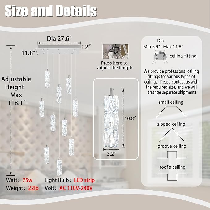 - 【Modern Crystal Chandelier Size】:10-Light Crystal Pendant Light. Lamp Body size: W3.2",H10.8". Ceiling canopy :W11.8" x L27.6" x H2". Height 118"(MAX)