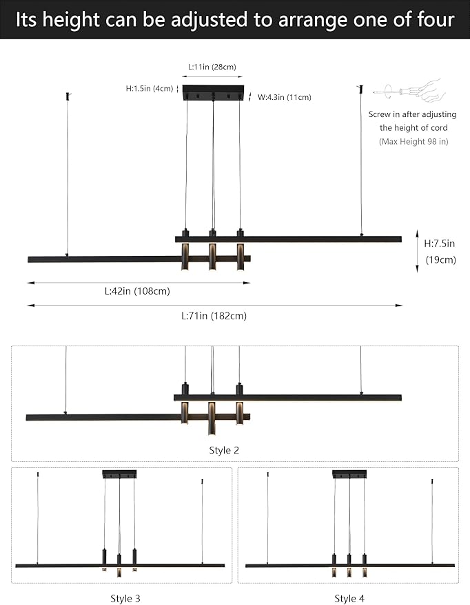 - 【Hanging Length Adjustable】 The modern linear chandelier with 98 inch adjustable cord, which is enough for you to adjust the height as you want,And it can be adjusted into four different shaped Hanging Light, you can freely change