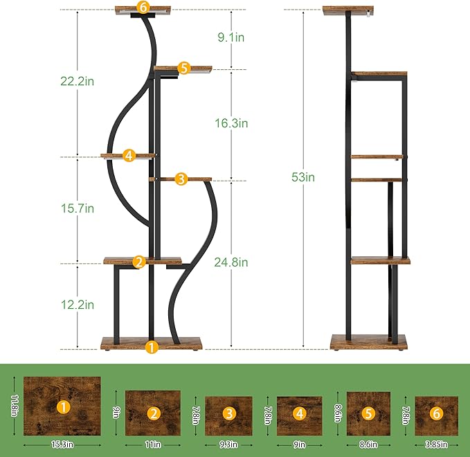 - 【6-Tier Plant Stand】 Inspired by the graceful silhouette of an hourglass, this six-tier plant stand seamlessly combines style and functionality. Its unique vertical structure, with well-defined layers and a harmonious design, creates a captivating display that invites nature's calm and vitality into your home, infusing your space with warmth and elegance.