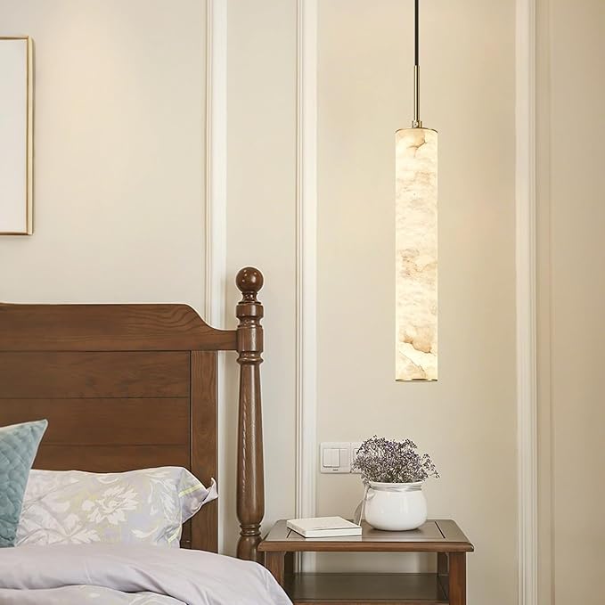 LMQNINE Natural Alabaster Pendant Lights for Kitchen Island White Marble Long Tube Chandelier Modern Gold Ceiling Light Fixtures for Bedroom Dining Room Table Living Room Hallway(M-1Pack)