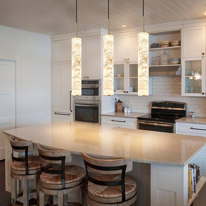 LMQNINE Natural Alabaster Pendant Lights for Kitchen Island White Marble Long Tube Chandelier Modern Gold Ceiling Light Fixtures for Bedroom Dining Room Table Living Room Hallway(M-3Pack)