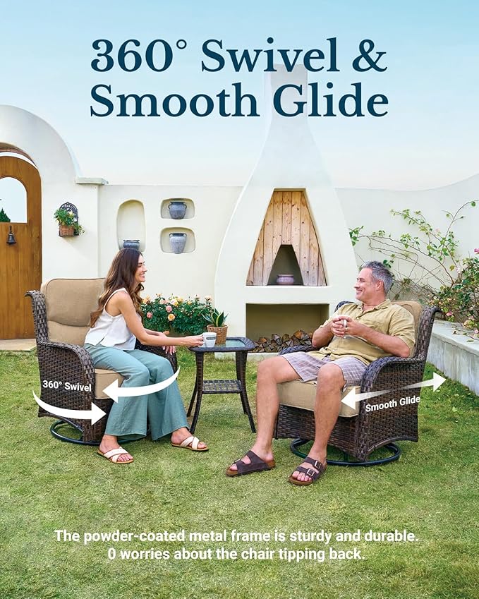 - Smooth 360° Swivel & Glide: Enjoy smooth 360° rotation and gentle rocking on the swivel chairs, while the couch offers roomy comfort. Whether you're sipping tea at sunset, catching up with friends, or hosting a cozy gathering with elderly family members—ideal for sharing laughter, stories, and quiet moments together