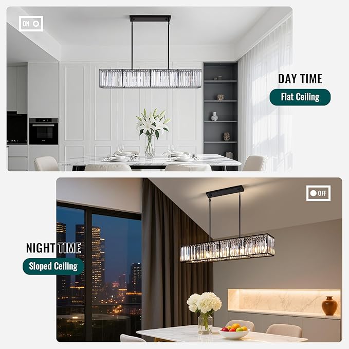 - ✨【Modern Black Crystal Chandelier】: The simple linear design adds a touch of elegance to your space and will become the centerpiece of your dining room. The relaxing and warm light atmosphere will make your space more inviting and opulent. Suitable for dining room, living room, kitchen island, bar, bathroom, pool table, etc.