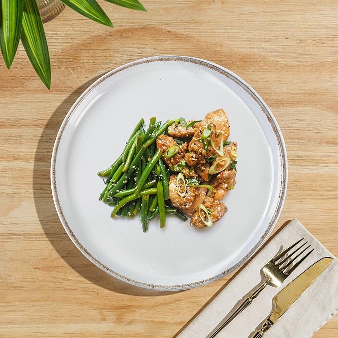 - MODERN DESIGN WITH HAND CRAFTED: These dinnerware sets are designed by professional artist, feature a unique wavy rim and a clear, speckled glaze finish. Each piece with handcrafted decorative is beautifully individual, adding a touch of sophistication to your table setting. and the slight ridge on the edge of the plates goes up a bit that can keeps any sauces/condiments on the plate instead of going off the edge that you'll never have to worry about things like gravy or dressings from spilling over the sides