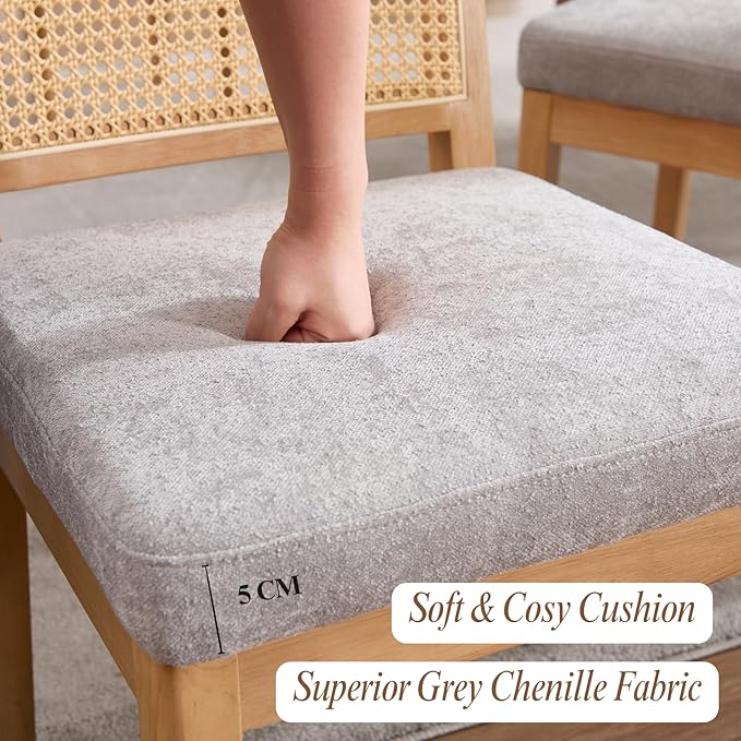 LukeAlon Farmhouse Rattan Dining Chairs Set of 4, Mid Century Modern Chenille Kitchen & Dining Chairs with Solid Wood Legs, Woven Cane Upholstered Kitchen Chairs Side Chairs for Dining Room, Grey
