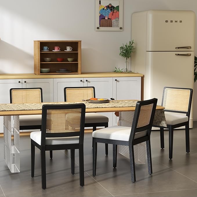 LukeAlon Farmhouse Rattan Dining Chairs Set of 4, Mid Century Modern Linen Kitchen & Dining Chairs with Solid Wood Legs, Woven Cane Upholstered Kitchen Chairs Side Chairs for Dining Room, Beige