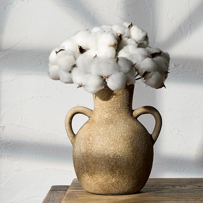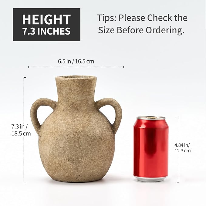- Measurements: The rustic vase with two handles measures 7.3" height and 6.5" width (include two handles).Perfect for greenery and dry or faux florals,but also can hold water for fresh flowers.The vase itself can be displayed indoors or outdoor as a fine decorative piece.