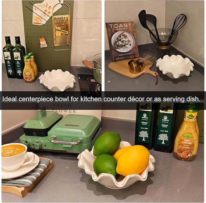 - Ruffled Edge Floral Design: Inspired from the lotus leaf, the delicate and wavy edges create a unique and natural look, making it an ideal centerpiece bowl for kitchen counter décor. Gold Trim Detailing: A refined gold accent along the rim adds a luxurious touch, elevating the style of any room or table setting