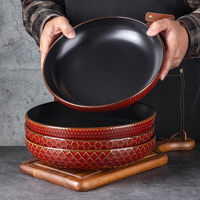 GBHOME 9.5'' Large Pasta Bowls, 42 Ounce Stoneware Salad Bowls for Kitchen, Ceramic Serving Bowls With Textured Pattern for Pasta,Fruit, Stews,Noodle, House-warming Gift, Set of 4-Rythmic Red