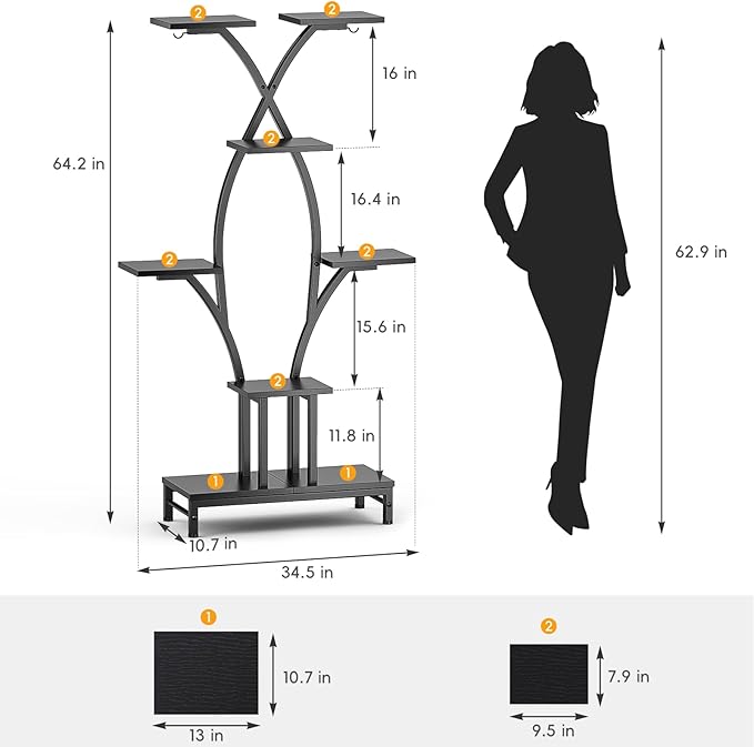 - [ 7-Tier, 63" Tall ] 63" tall plant stand with 7 tiers, 7 pot stands, and 2 hooks for hanging plants. Space-saving X-shape fits corners, adding style and functionality to your home decor