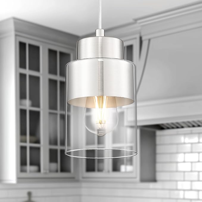 - Trending Design: The pendant light fixture showcases a double-layer design, featuring a cylindrical glass shade that elegantly encases a brushed nickel metal inner shade. Its modern and stylish appeal makes it a suitable fit for various interior styles, while the unique yet minimalist aesthetic adds a distinct touch of elegance to your home