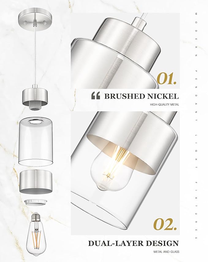 - Trending Design: The pendant light fixture showcases a double-layer design, featuring a cylindrical glass shade that elegantly encases a brushed nickel metal inner shade. Its modern and stylish appeal makes it a suitable fit for various interior styles, while the unique yet minimalist aesthetic adds a distinct touch of elegance to your home