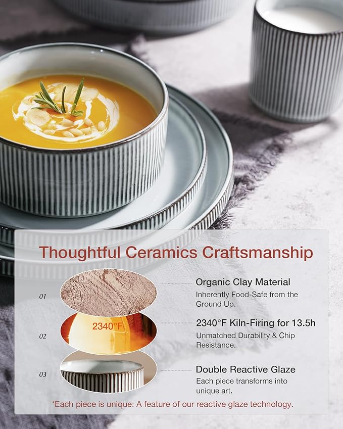 - [Premium Ceramic Durability]: Fired at 2340°F for 13.5 hours, our dishes boast impressive weight and thickness. They can resist chipping, scratching and daily wear, ensuring reliable kitchen use. Enjoy worry-free daily use, even with silverware