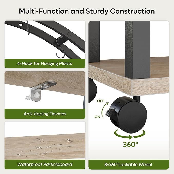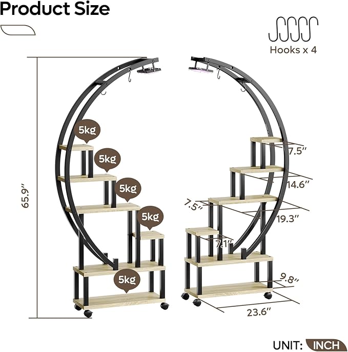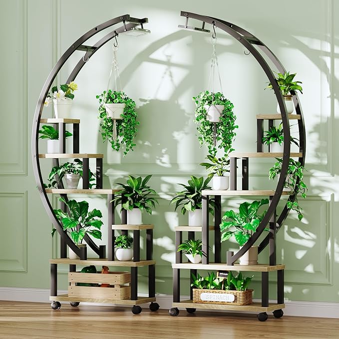 Bestier Plant Stand Indoor with Grow Lights, 6 Tiered Metal Plant Shelf with Wheels for Plants Multiple, Half-Moon Shape Plant Rack Display Shelf, Large Plant Holder for Home, Patio, Balcony (2 Pcs, Oak)