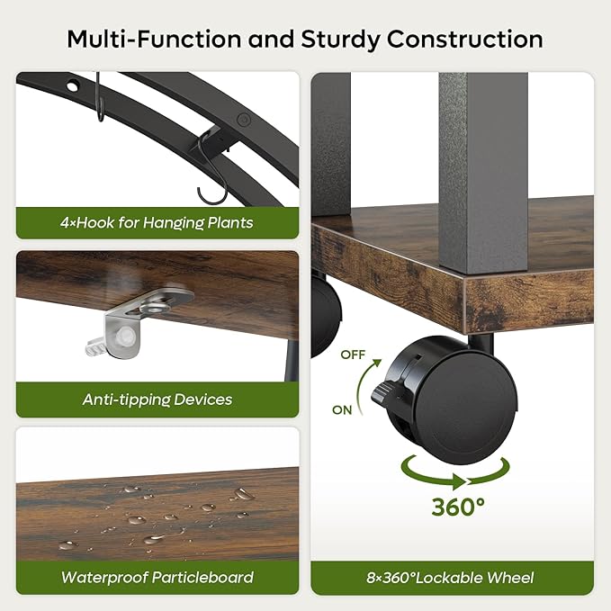 - High-Quality Materials: The indoor plant shelf is made of heavy-duty metal iron pipe and thickened particleboard, which is sturdy and durable with strong load-bearing capacity. The metal frame surfaces are all treated with anti-rust treatment, and the particleboard surfaces are also coated with a water-resistant layer to prevent corrosion and are easy to clean. We also include an anti-tipping device, so if you have kids and pets, please install it on the plant holder.