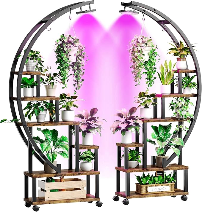 Bestier Plant Stand Indoor with Grow Lights, 6 Tiered Metal Plant Stand with Wheels for Plants Multiple, Half-Moon Shape Plant Rack Display Shelf, Large Plant Holder or Home, Patio, Balcony (2 Pcs, Brown)