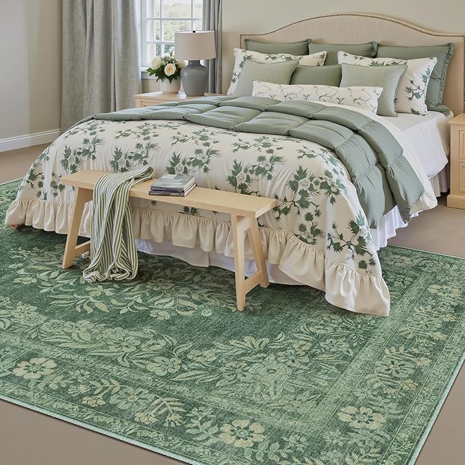 5x7 Area Rug Green Washable Vintage Distressed Living Room Carpet Large Bedroom Indoor Medallion Floral Non Slip Retro Throw Floor Mat for Office Dining Room Kitchen Bathroom