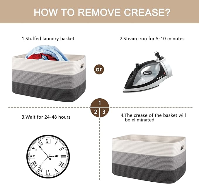 - Washable Large Basket: This large basket can be washed by hand or machine with gentle detergent. If machine washed, please put them into a laundry bag. NOTE: These cotton rope baskets are folded when shipping, but it will turn back to its elegant shape quickly if you fill it with some towels or clothing, and iron is great idea to remove the creases