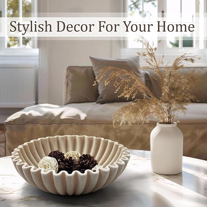Ruffle Decorative Bowl, Large Fruit Bowl for Kitchen Counter, Stylish Key Bowl for Entry Table, Handcrafted Home Decor Display bowl, Artificial Stone Beige