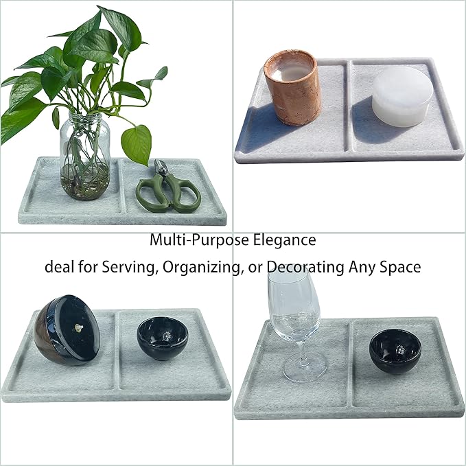 10"x8" Natural Marble Decorative Tray – Dual‑Compartment Stone Vanity Organizer for Jewelry, Keys & Soap – Premium Heat‑Resistant Bathroom Decor Gift(Belken White)