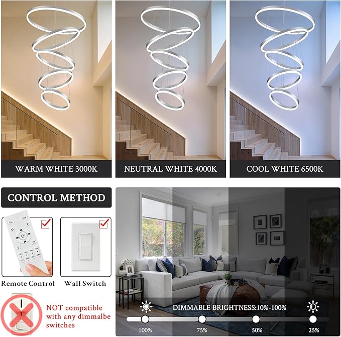 - Chandelier for Foyer: This modern led chandelier is designed in silver shade with 5 rings, simple and elegant, it creates a cozy atmosphere in your home. This modern chandelier is perfect for living room, staircase, foyer, dining room, entryway.