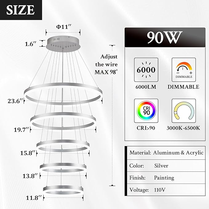 - LED Chandelier Adjustable: Diameter 23.6''+19.7''+15.8''+13.8''+11.8'', you can DIY multiple shapes by adjusting the strings. This high ceiling chandelier is adjustable from 10 inches to 98 inches, and it will perfectly fit the height of your ceiling.