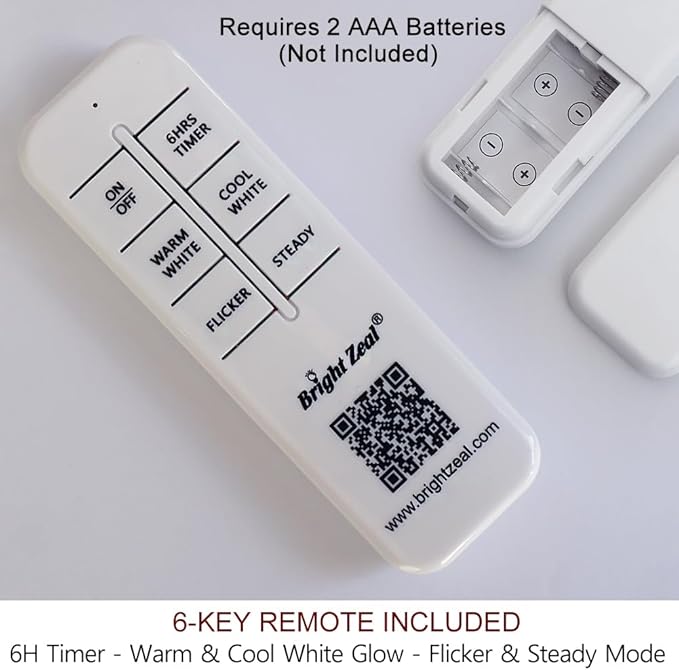- 6-KEY REMOTE - The remote features ON/OFF switch, 8H Timer, WARM WHITE glow, COOL WHITE glow, two lighting modes: FLICKER (Flicker Effect) & STEADY (Steady Glow). Works with multiple lanterns at once or separately. - Eight-Hour Timer: can be left on for 8 hours and then remains off for 16 hours, only to light up again for another 8 hours automatically. - The lantern requires 3 AAA batteries to operate (Not Included). The remote requires 2 AAA batteries to operate (Not Included).