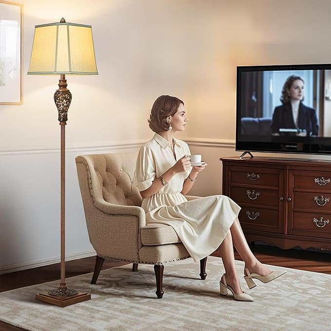 - UNIQUE DESIGNS: The farmhouse Floor lamp with vintage and luxury style. Exquisite hollow carved night light and base, this design makes the standing lamp elegant and beautiful. Lamp body is made of resin and metal with bronze and faux woodgrain finish.