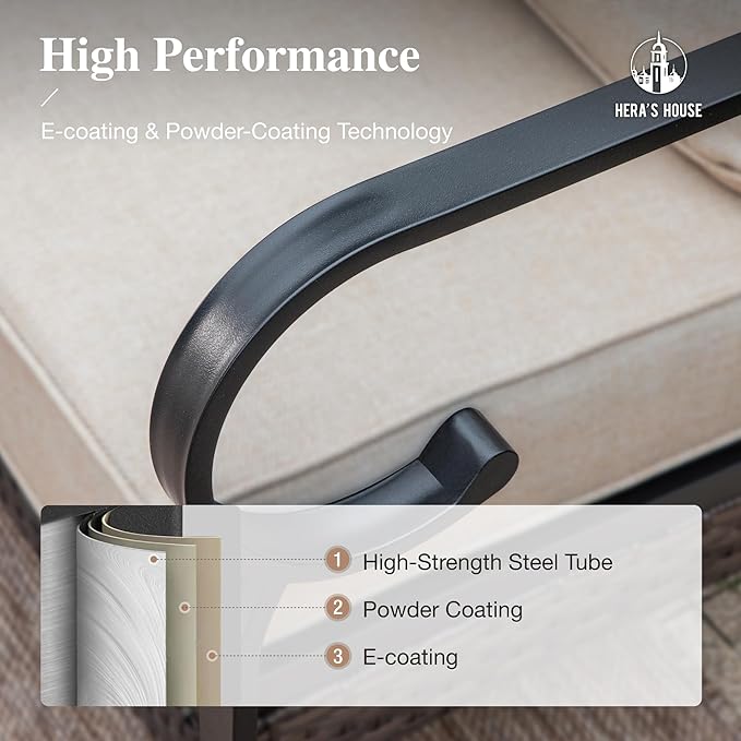 - 【E-COATING & POWDER-COATING TECHNIQUE】ALL the HERA'S HOUSE metal frame of conversation sets are processed by high-performance E-COATING and POWDER-COATING technique which provides extended protection against rust, scratches, rain, and UV harm. All weather resistant, anti-rust, easy to clean, no special care needed.