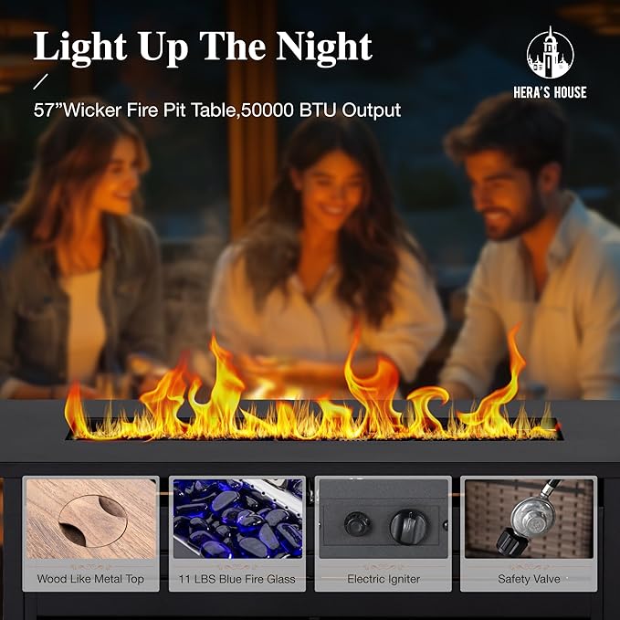 - 【56" FIRE PIT TABLE】Large rectangular elegant fire pit talbe with removable lid.CSA CERTIFIED 50,000 BTU stainless steel burner with integrated ignition to provide the most sufficient flame. Wood-like table top makes it easy to clean and maintain, giving your home a long-lasting, Texture and retro design will complement your other decorative items. A standard 20lbs propane tank (NOT INCLUDED) fits the table perfectly