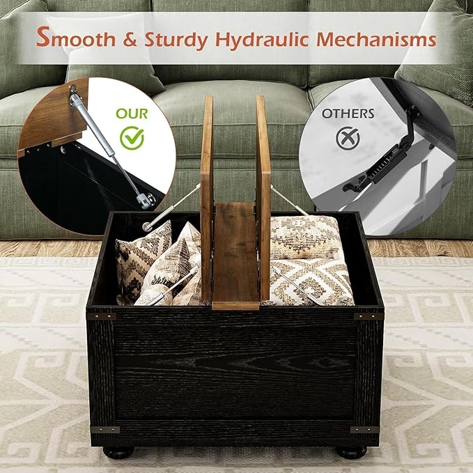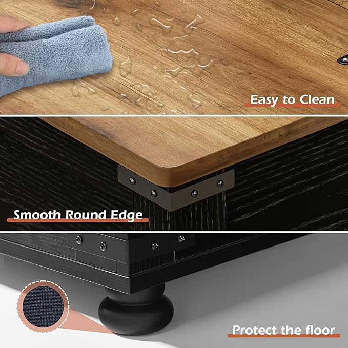 - Smooth and Safe Lifting: The high-quality metal mechanism with gas struts ensures easy lifting and lowering, preventing finger pinching and enhancing safety. Both sides of the black coffee table tabletop can rotate up to 60 degrees and stay at any angle for easy access