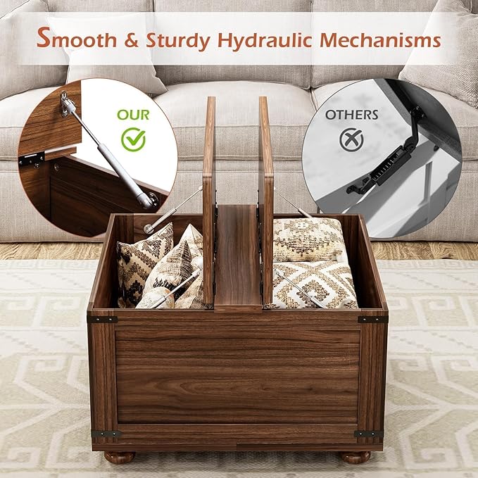 Farmhouse Coffee Table with Storage, Large Square Coffee Table with Wood Gourd Feet and Hydraulic Gas Rod for Living Room, Walnut